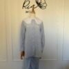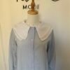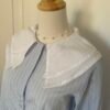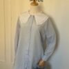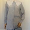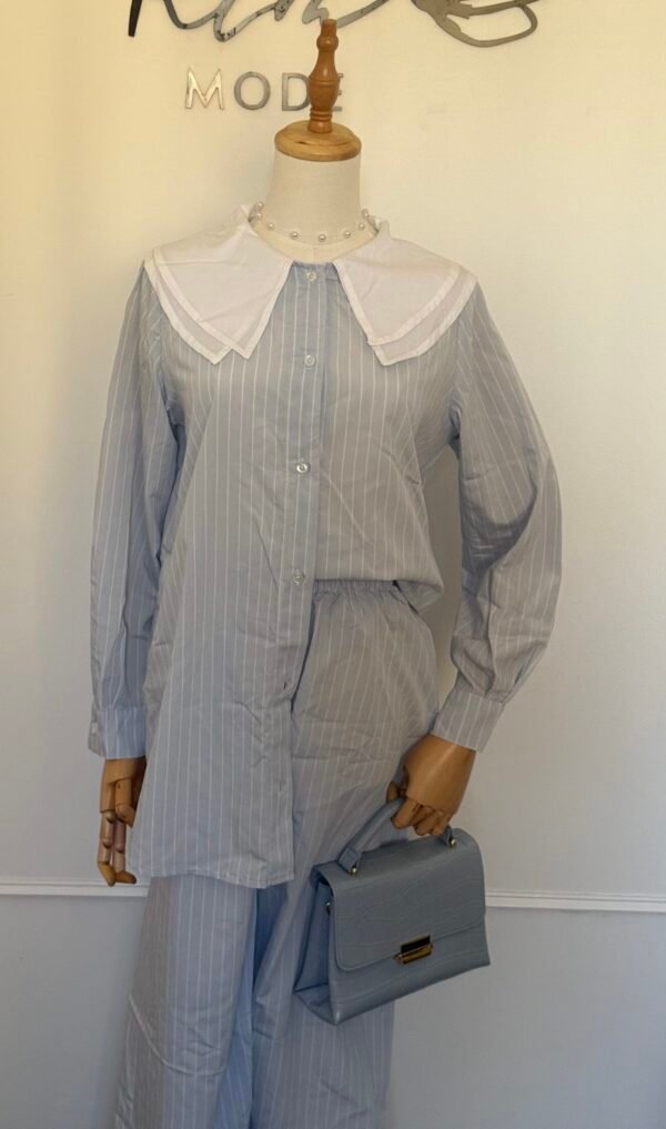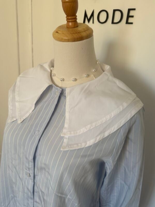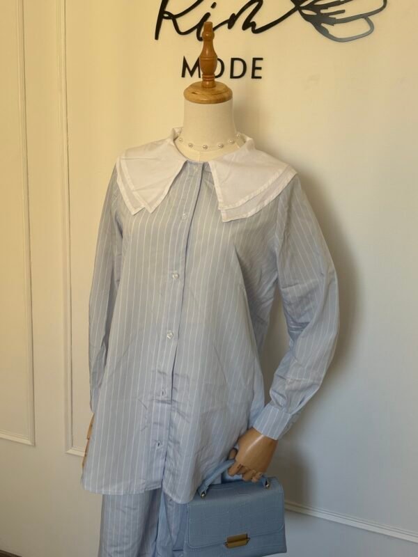 ✨ Chemise rayée bleu clair à fines lignes blanches, coupe longue et ample.