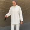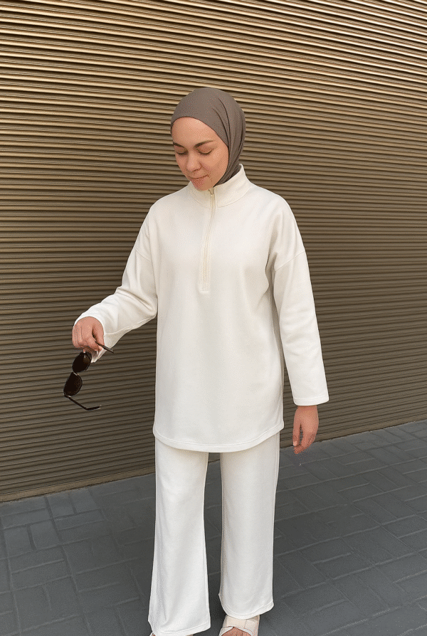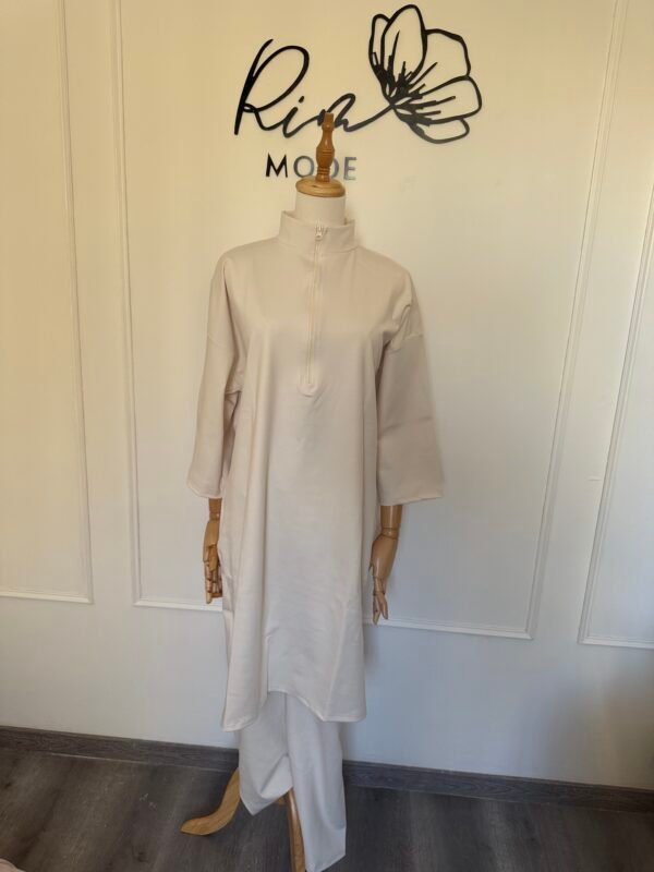 Craquez pour cet ensemble épuré et moderne, composé d’une tunique beige oversize et d’un pantalon fluide assorti.
